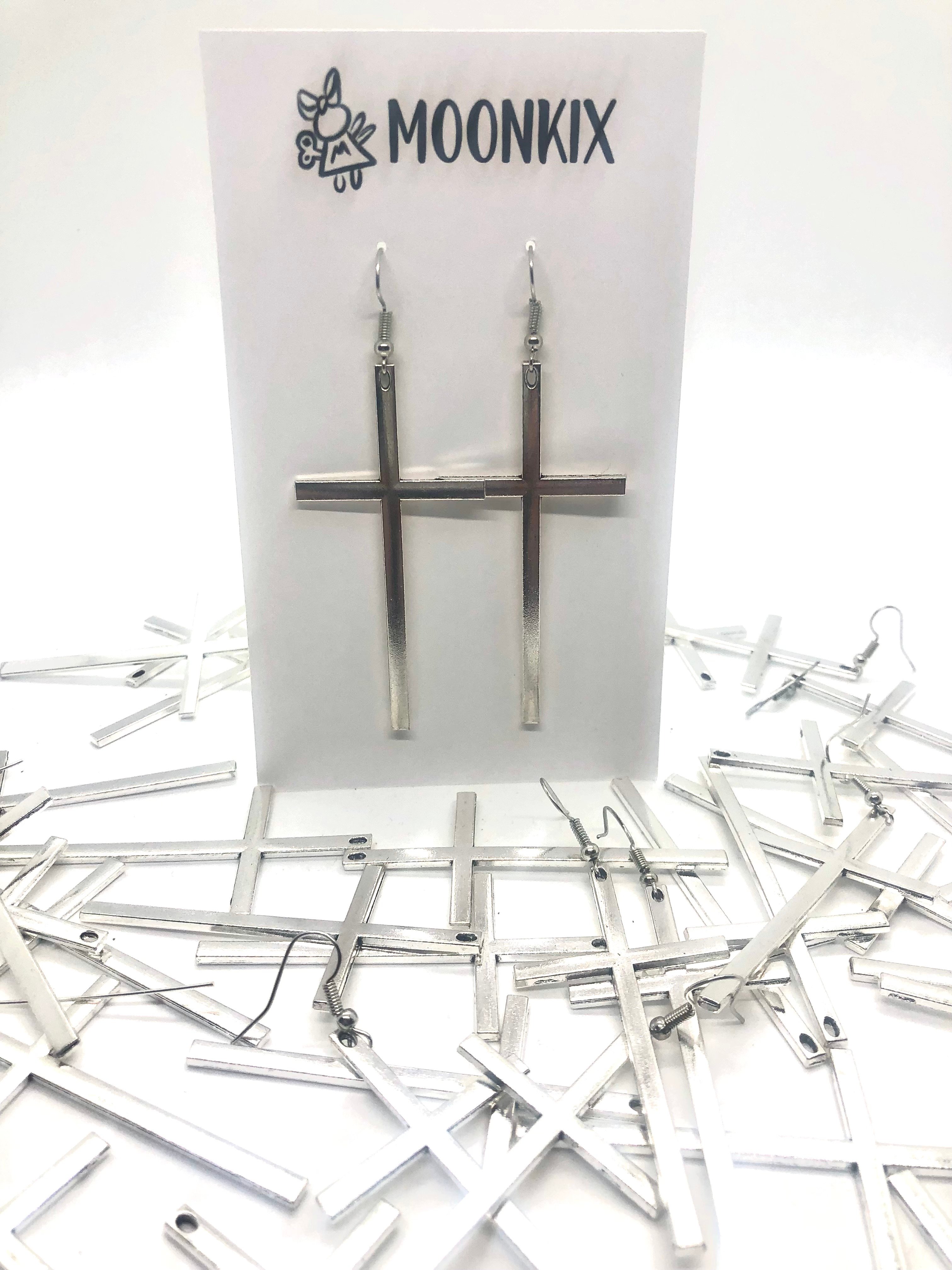 Our "Old School Cross" earrings measure approximately 3" and are secured with surgical steel french hooks. Wear one, wear four!
