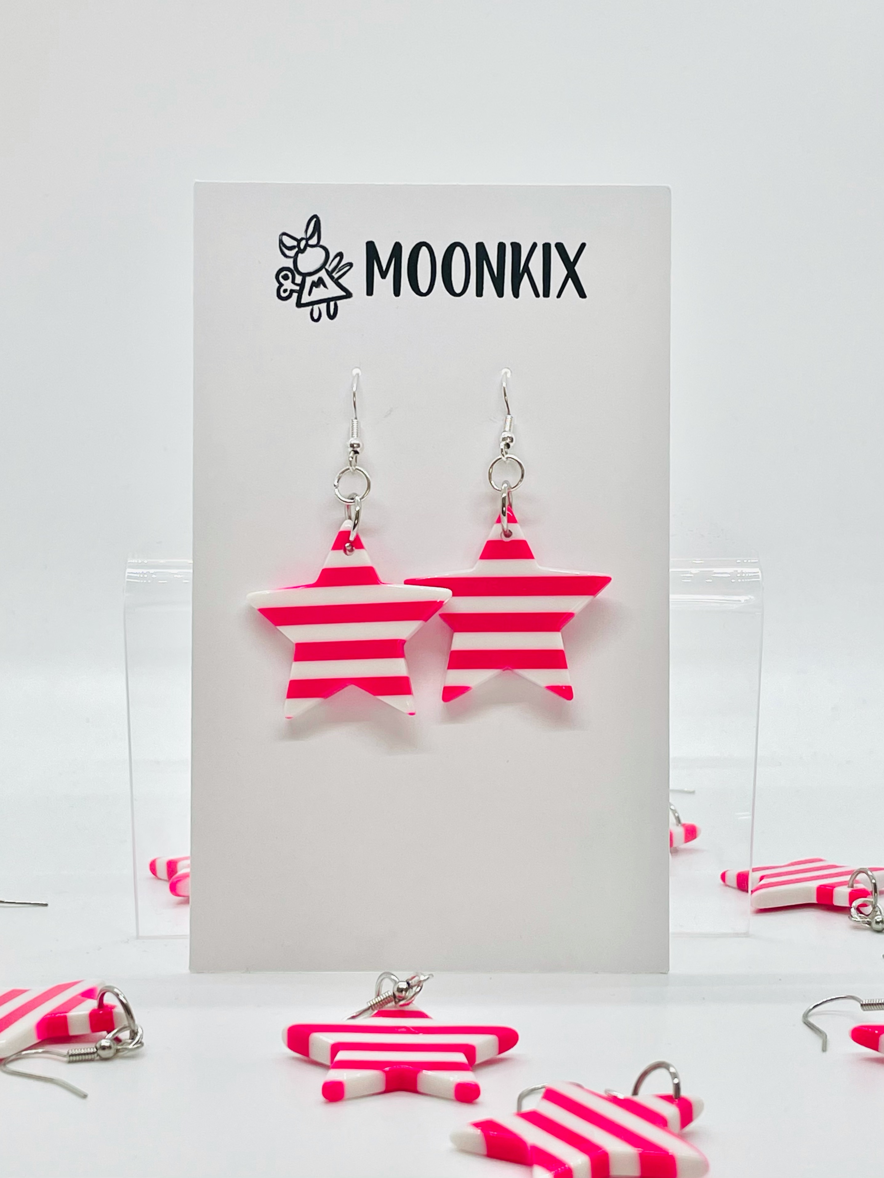 Are you a boogie woogie bugle boy or vintage swimsuit kinda gal? If so, grab a pair of our 35mm resin dangle "Stars 'n' Stripes" earrings with silver french hooks.