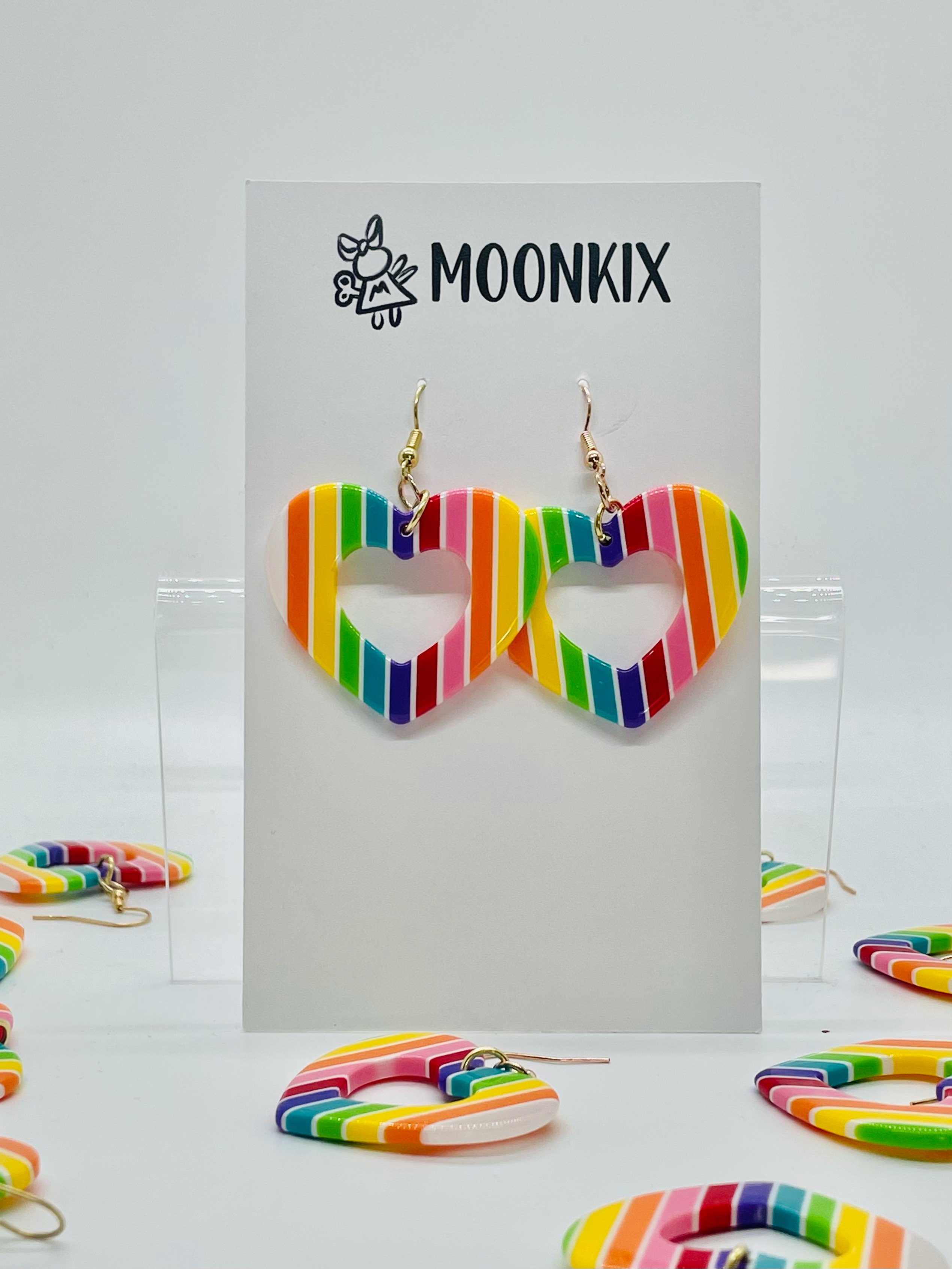 Our "One Love" earrings are perfect for Pride celebrations, 80s roller skate nights, and just plain fun in the sun. Measuring 35mm, these resin hearts are secured with gold-finish french hooks.