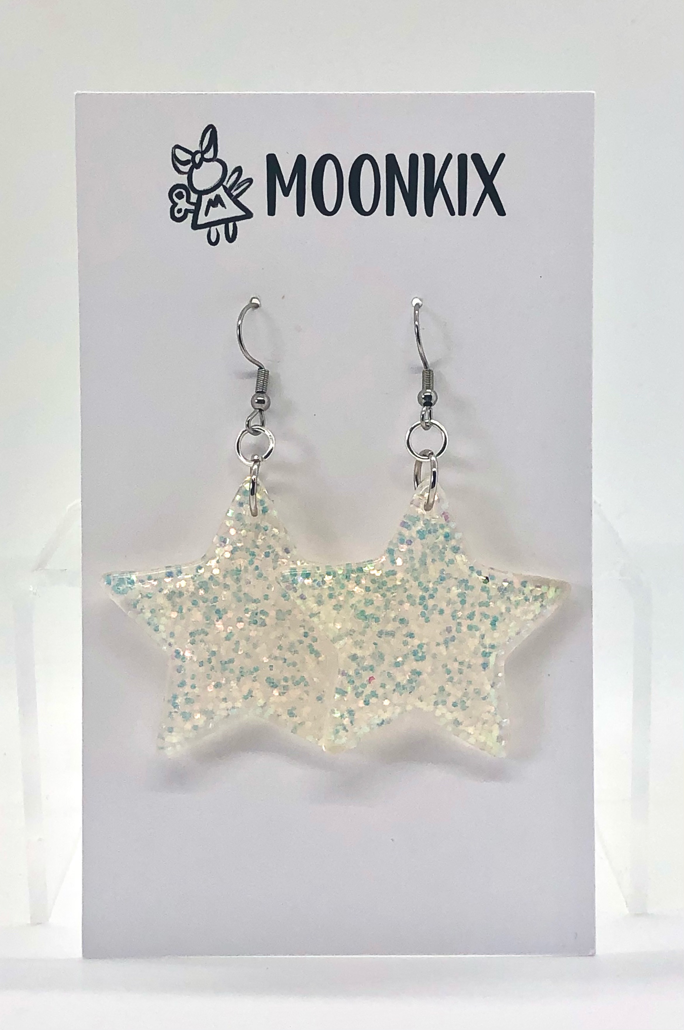 Our show-stopping iridescent stars feature gold and silver sparkles in an acrylic form with french hooks (silver finish).