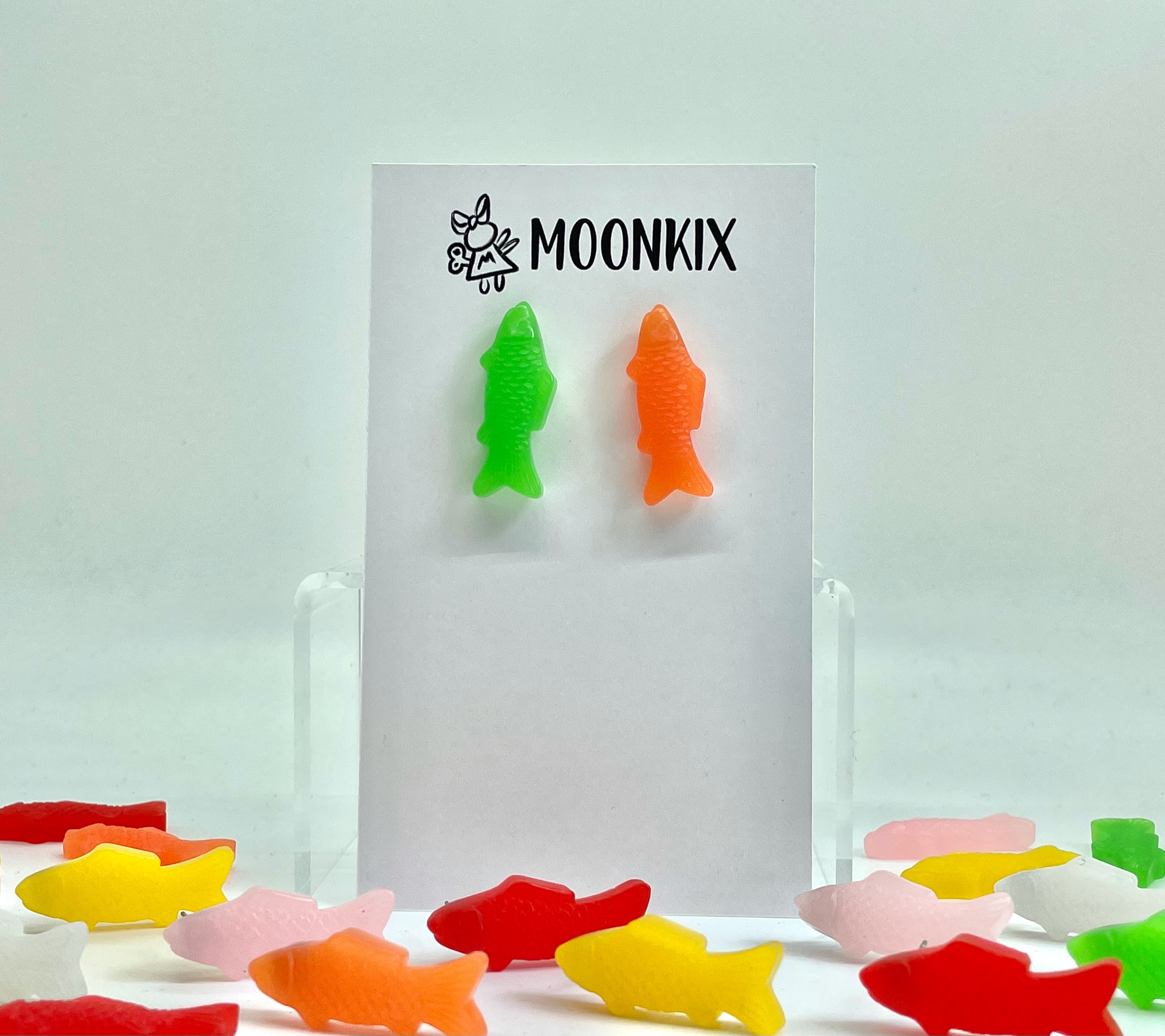 Our multi-colored 33mm gummy fish are perfect for warm summer days by the river and pair nicely with the daiquiri of your choosing! These little fishies are made of resin, are flat-backed, and secured with surgical steel posts.
